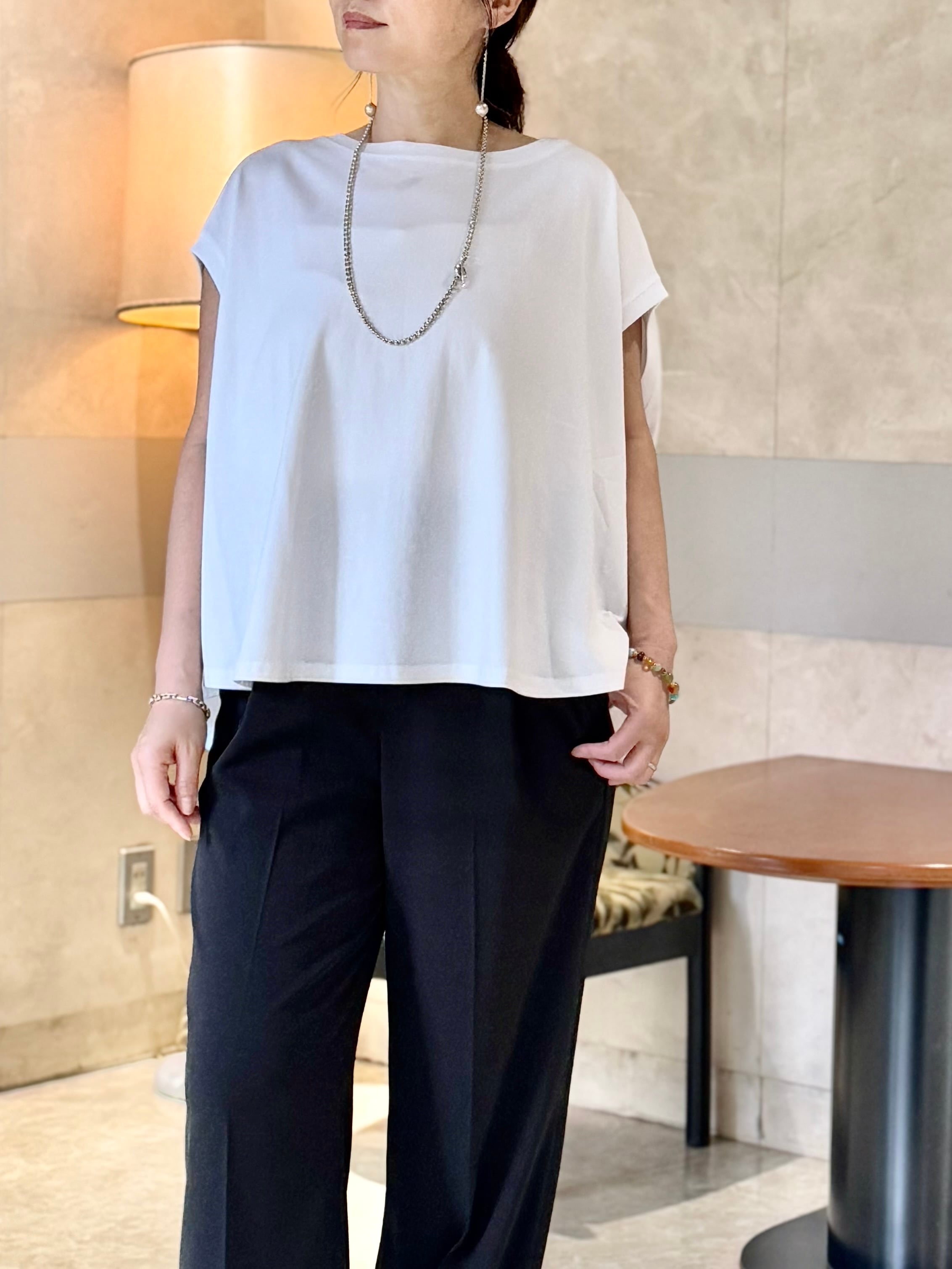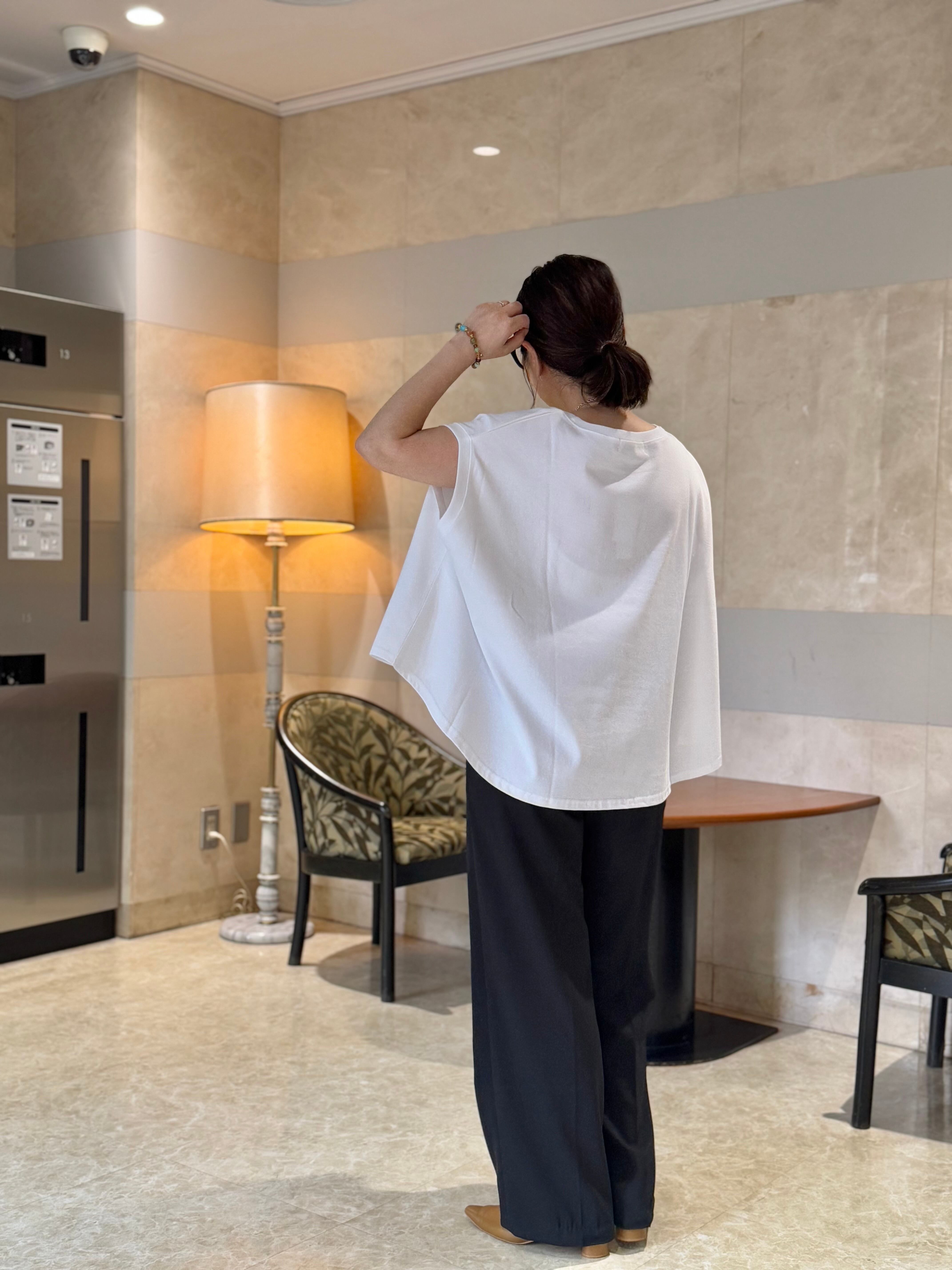 体のラインを拾わないのに着用すると華奢見えするフレアノースリーブプルオーバー。