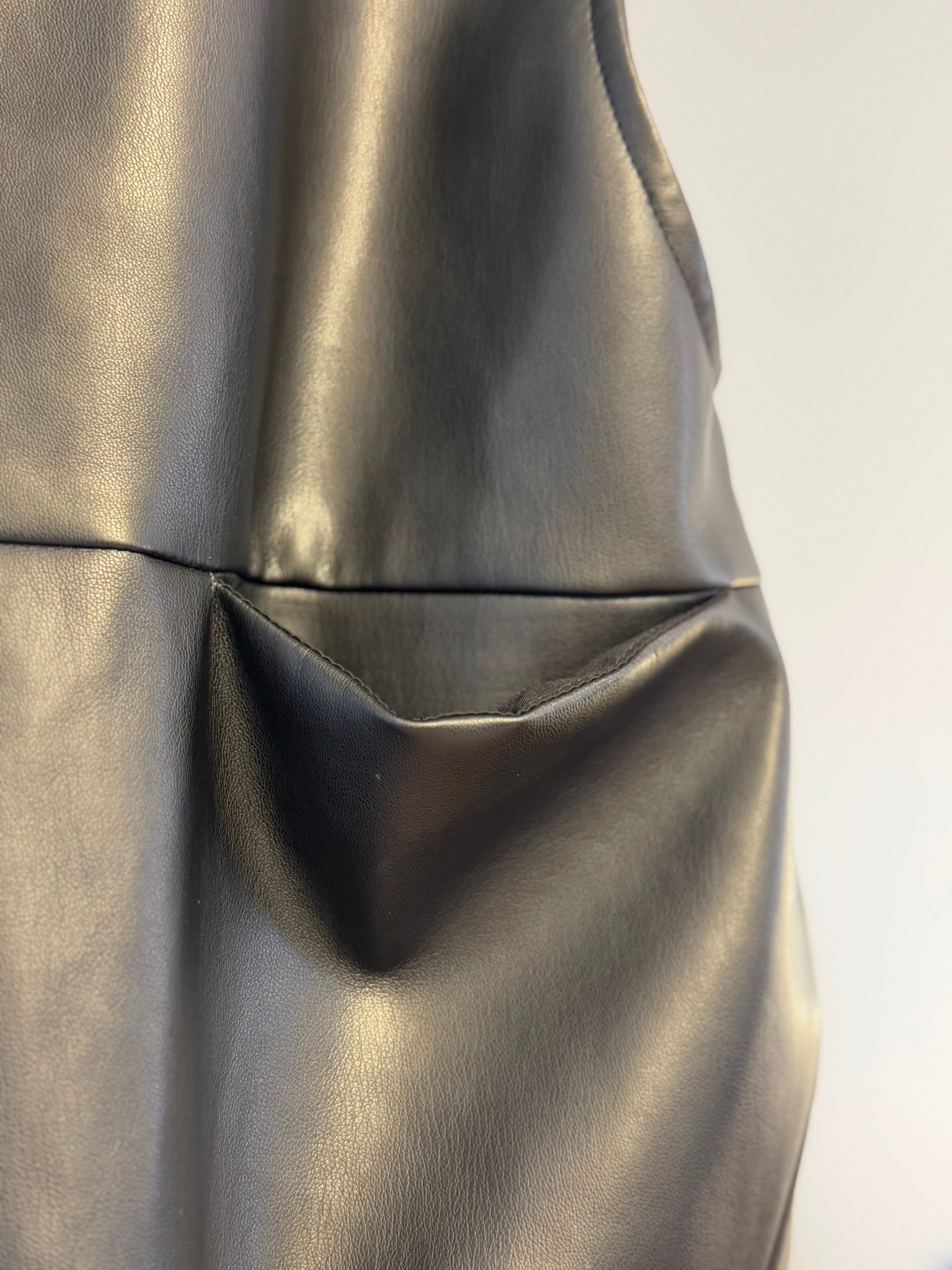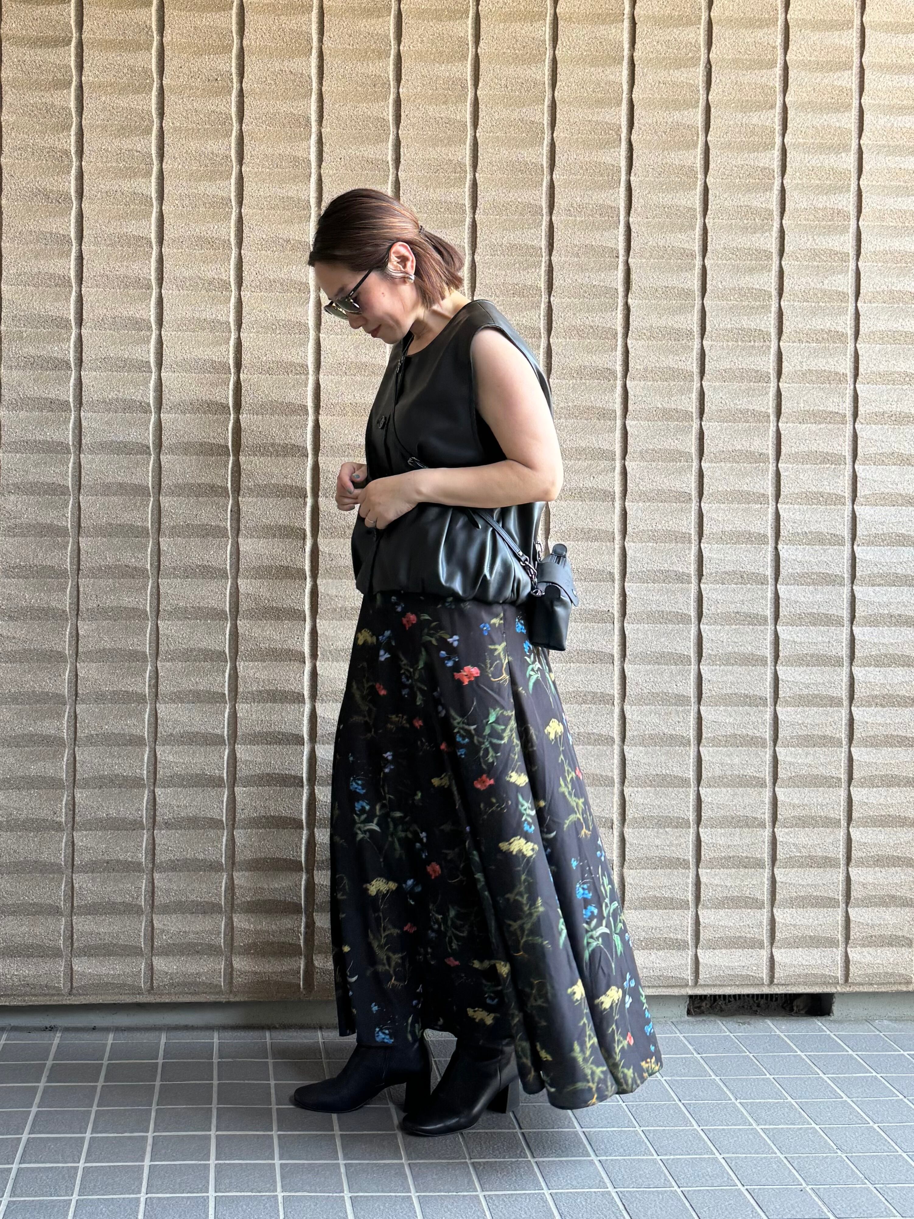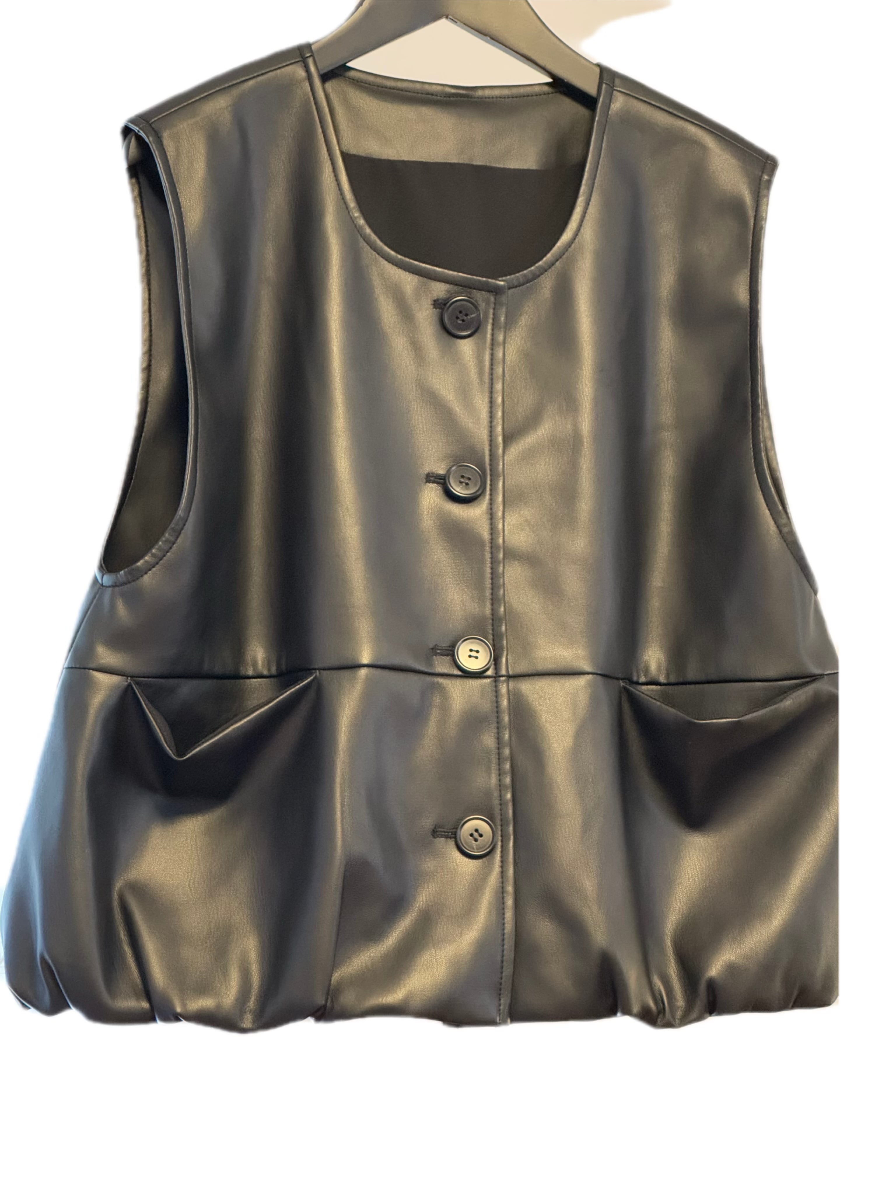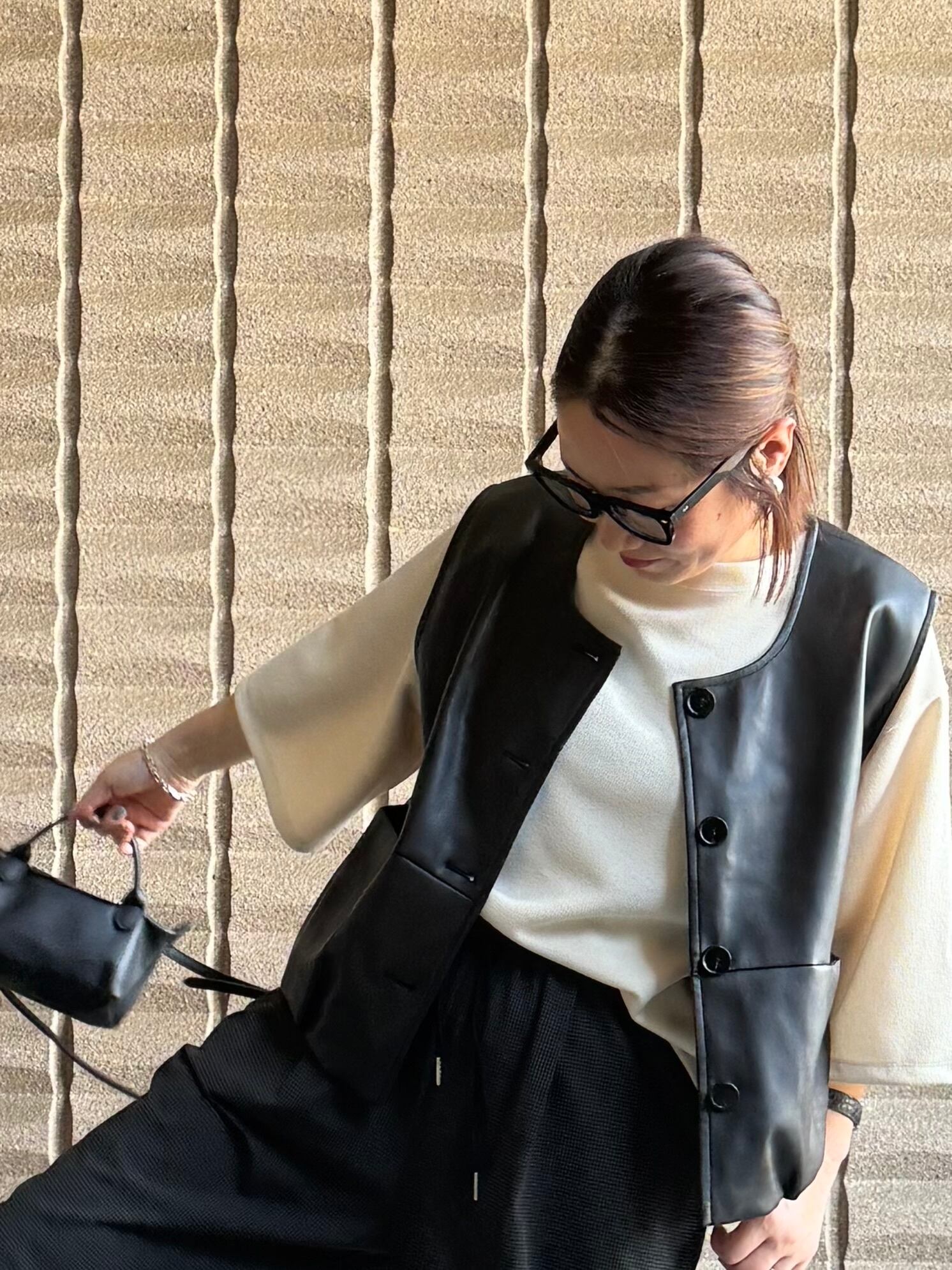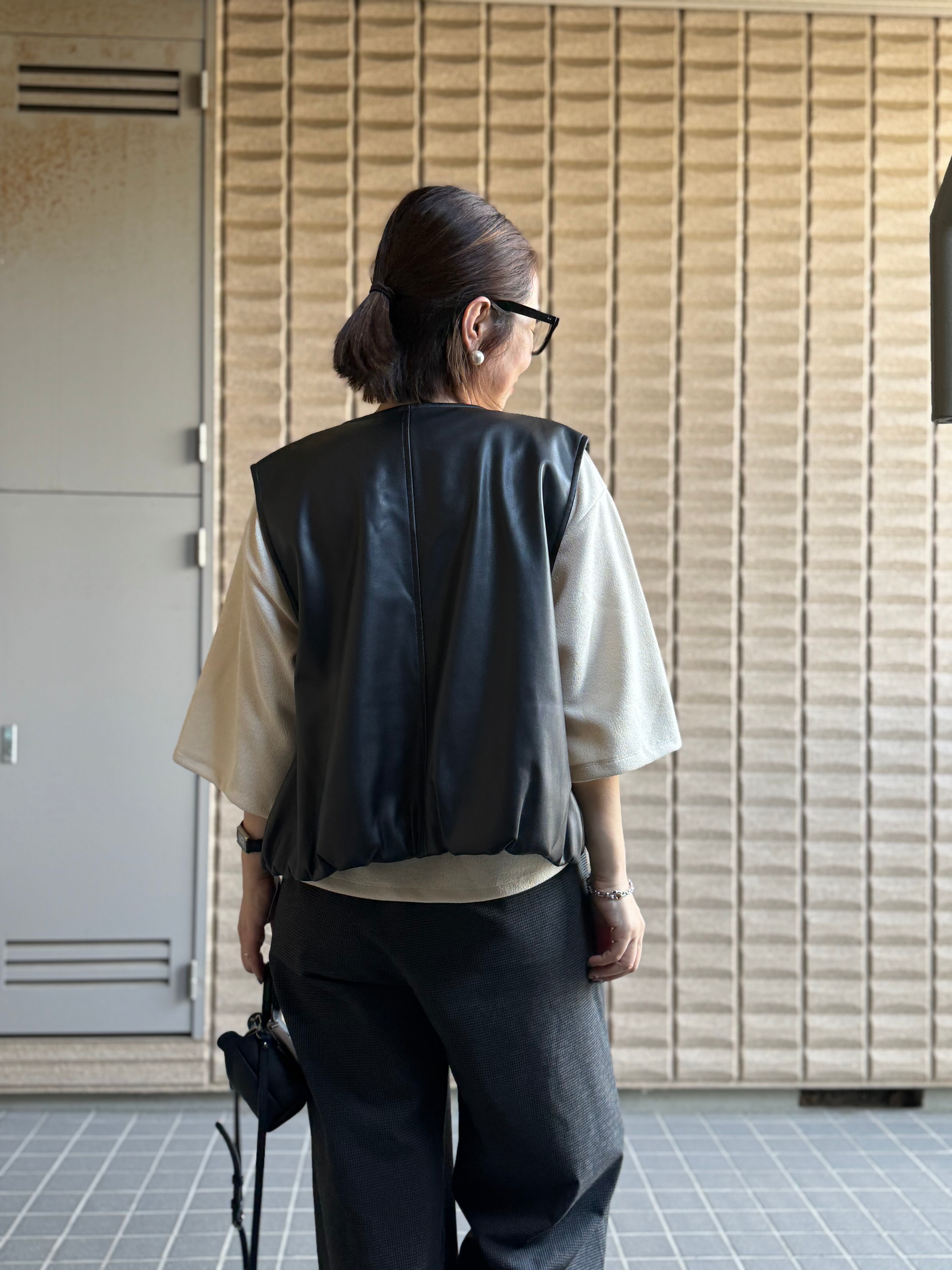 メンズライクになりがちなレザーベストですが裾をシャーリングにし、丸みのあるバルーンシルエットにすることで女性らしい印象に◎