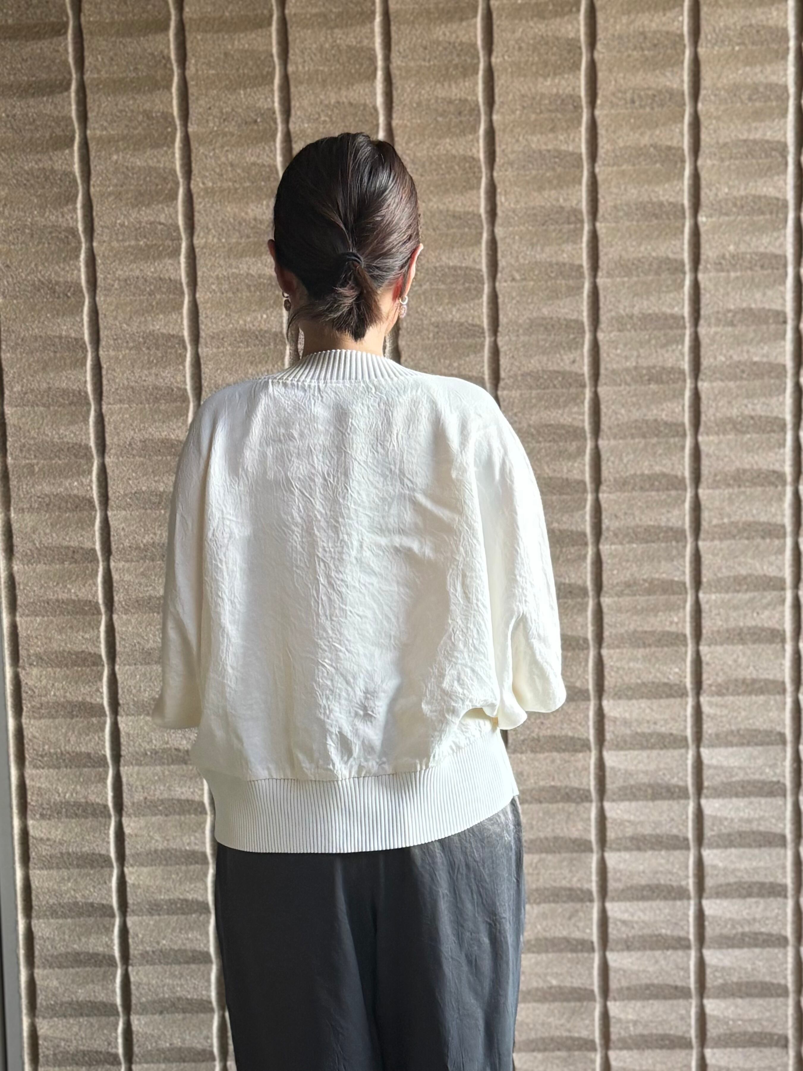 優雅な光沢感が魅力のma couleur(マ クルール)異素材リブドルマンブラウス。日本製の高品質な素材を使用し、アセテート特有の美しい光沢感が、カジュアルなスタイルにもエレガント感をプラスします。