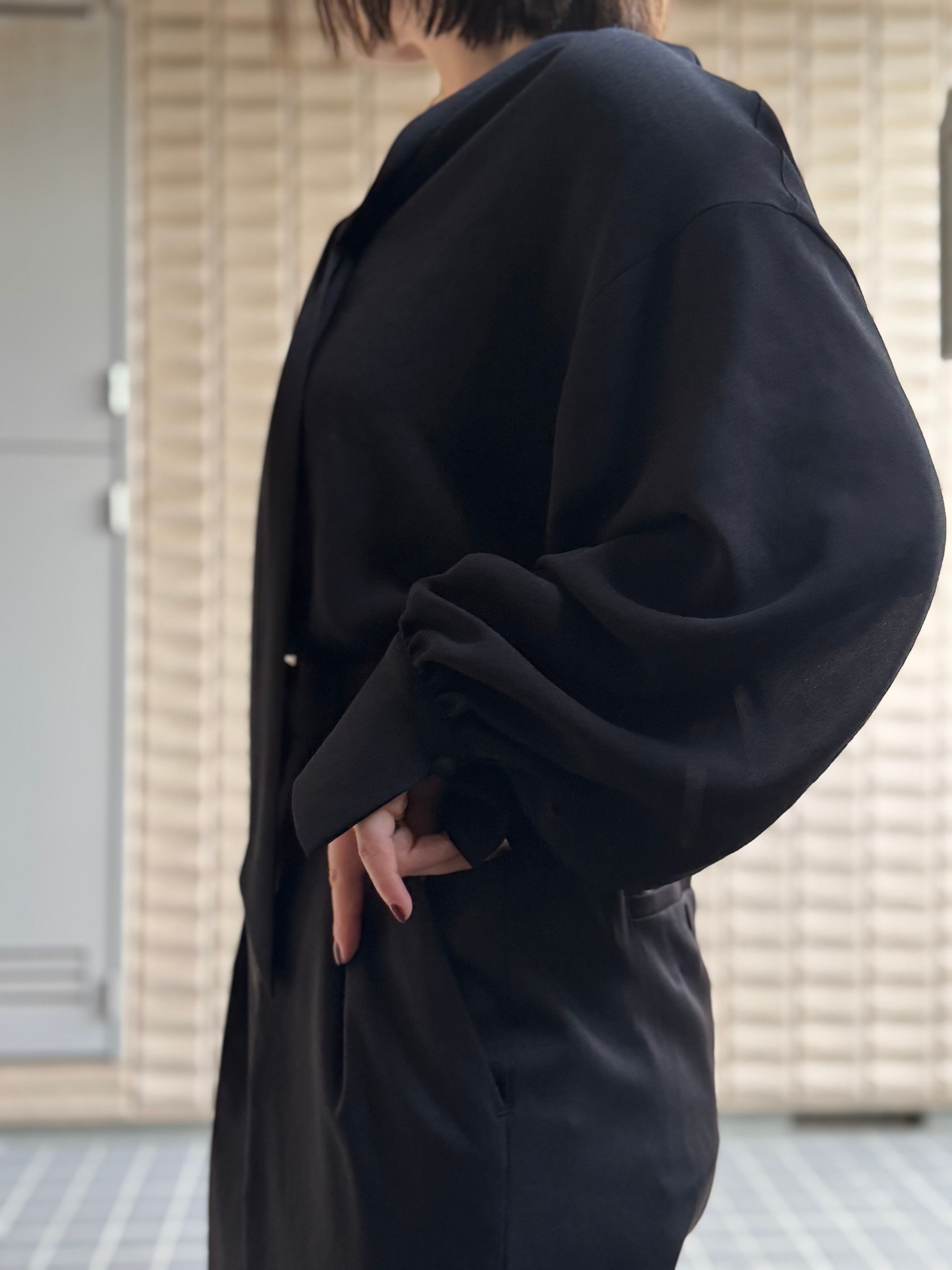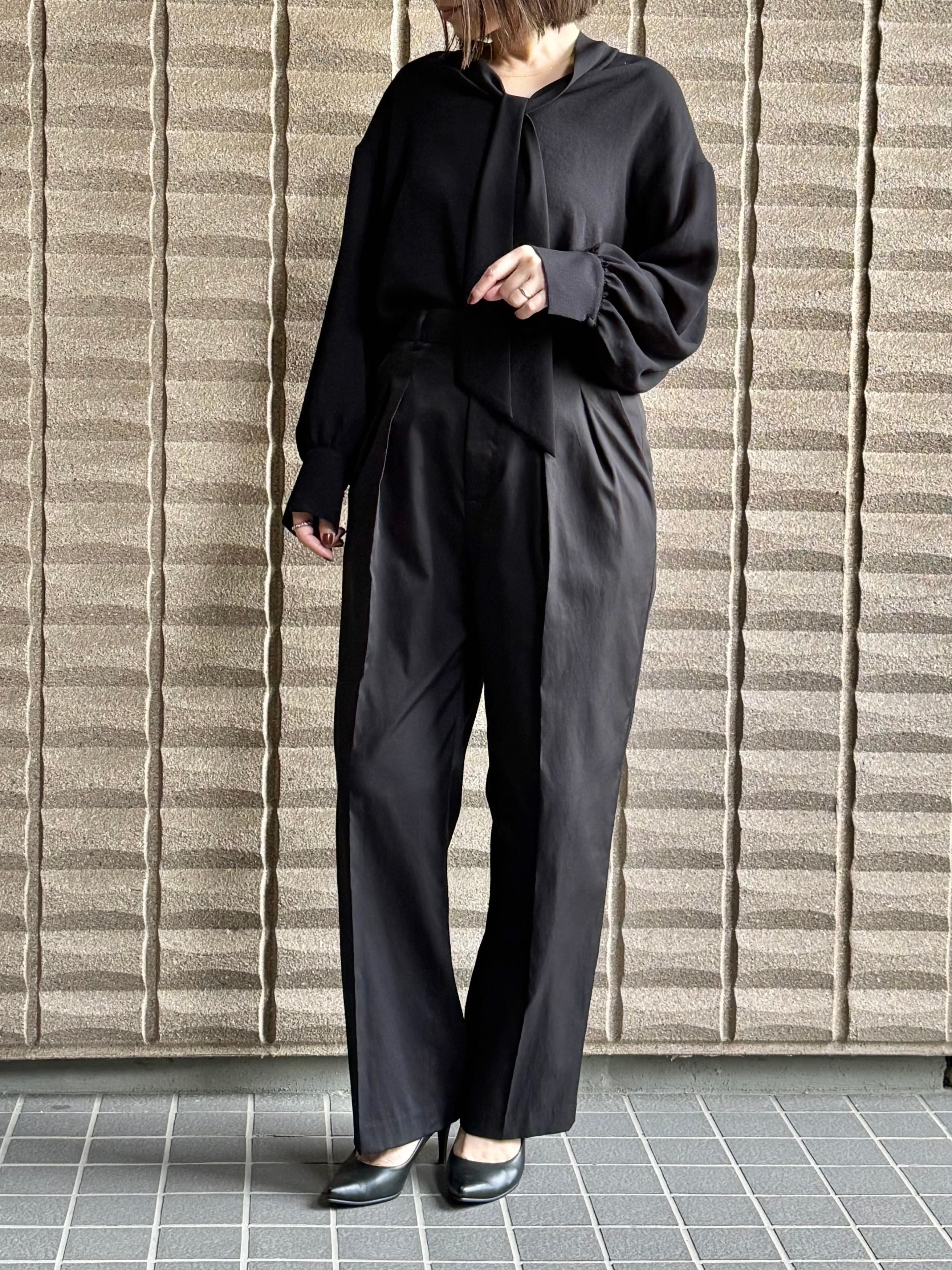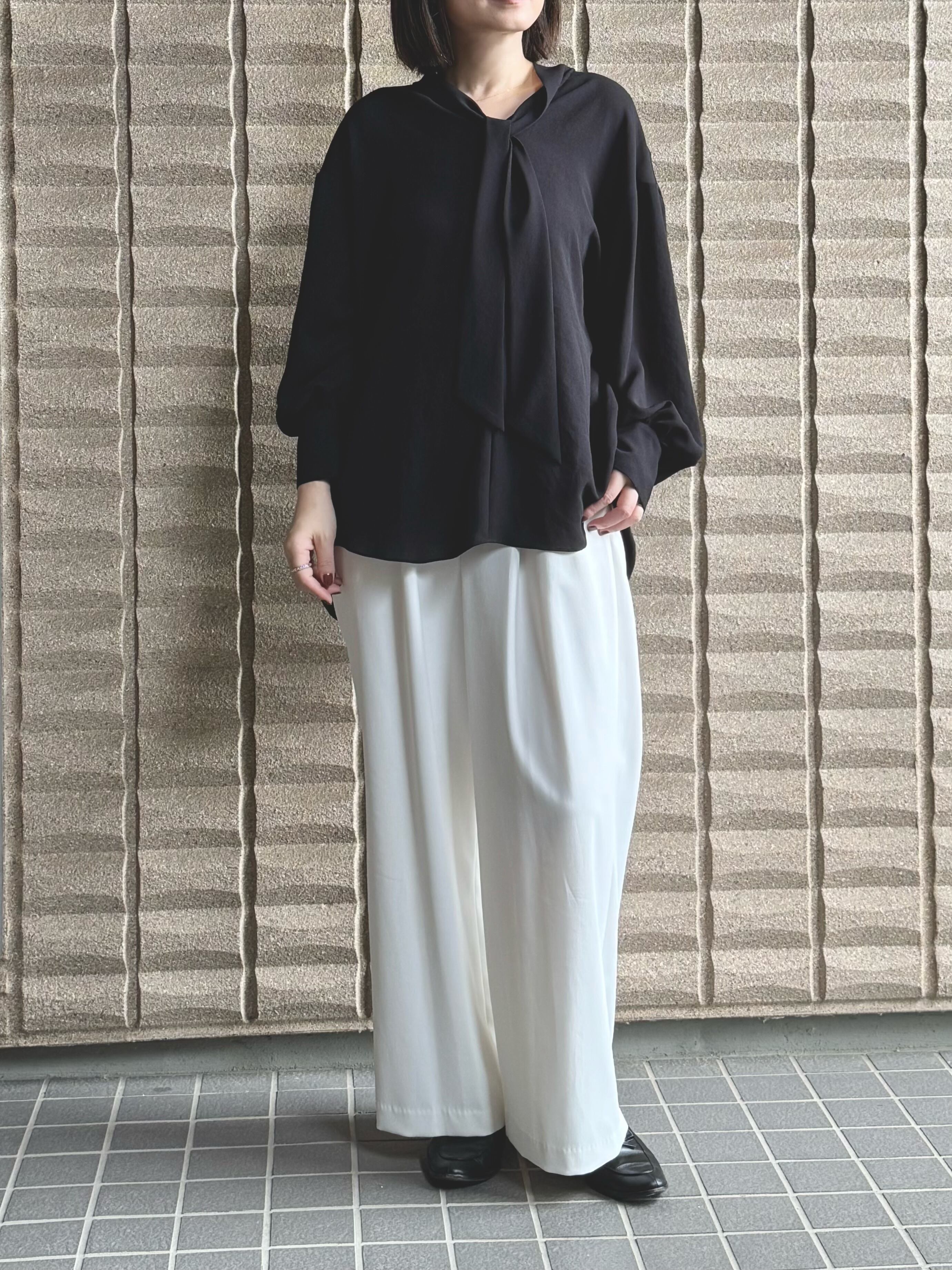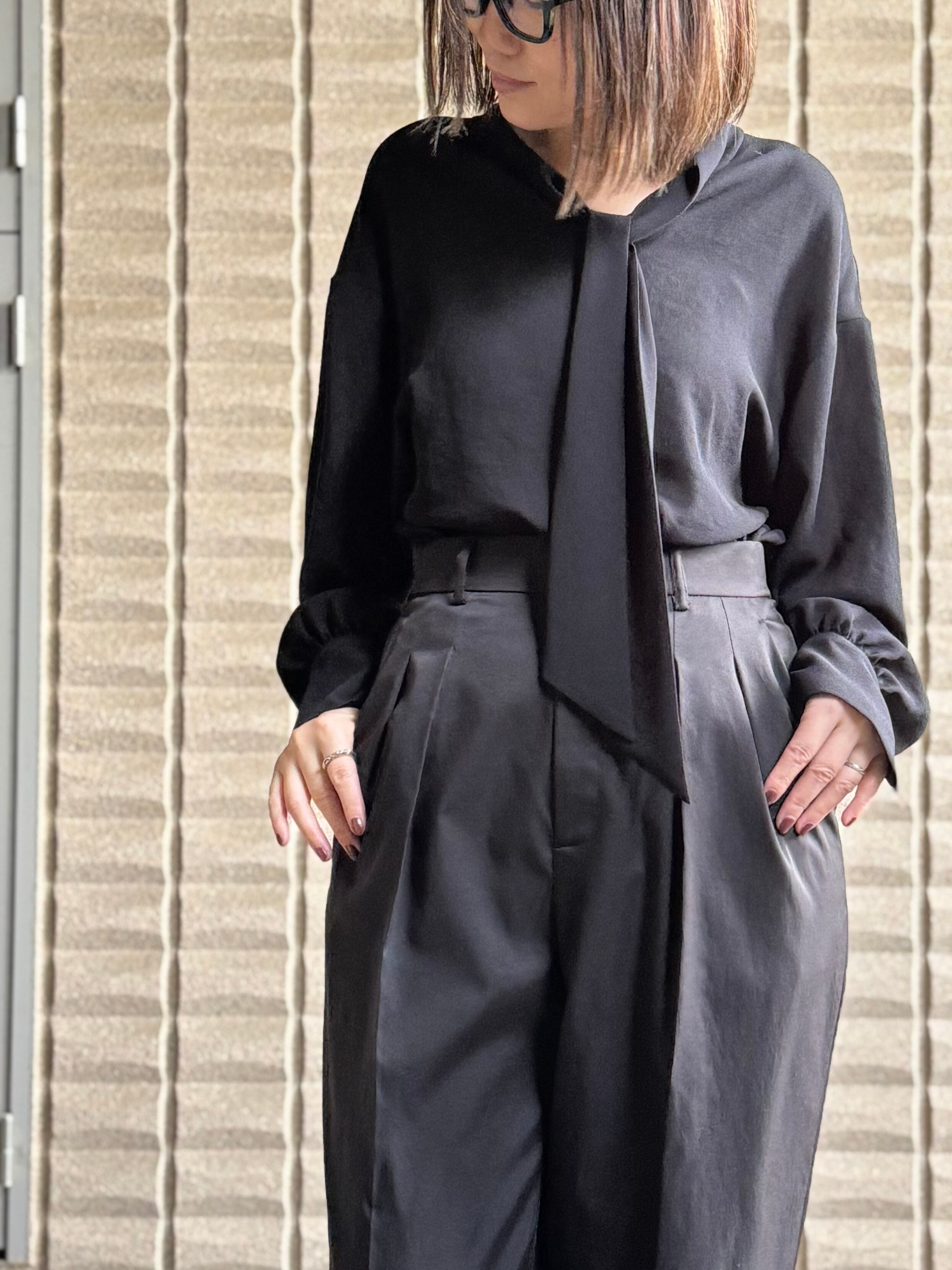 上品なとろみ素材を使用したボウタイデザインのブラウス。軽やかで落ち感のある素材を使用。シワになりにくく、デイリーにもオフィスシーンにも使いやすい魅力的な一着です。
